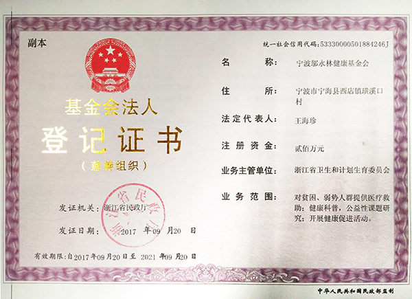 宁波邬永林健康基金会,成立于2010年10月,是在浙江省民政厅注册、由浙江省卫生健康委主管的非公募基金会。基金会的原始基金数额为人民币贰佰万元,来源于双林股份有限公司。《慈善法》颁布后,本基金会被认定为慈善组织。